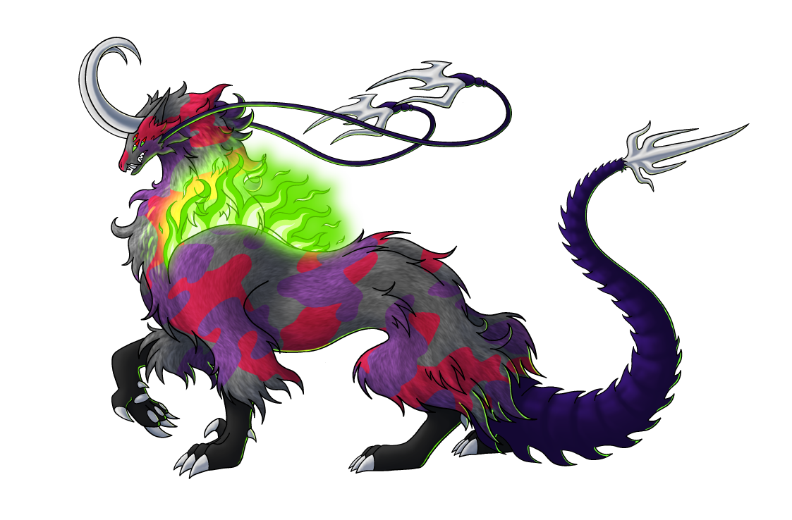 Colors: body dark grey, with fur light grey strewn with wobbly lilac and red-violet, tail dark purple; bright green balefire