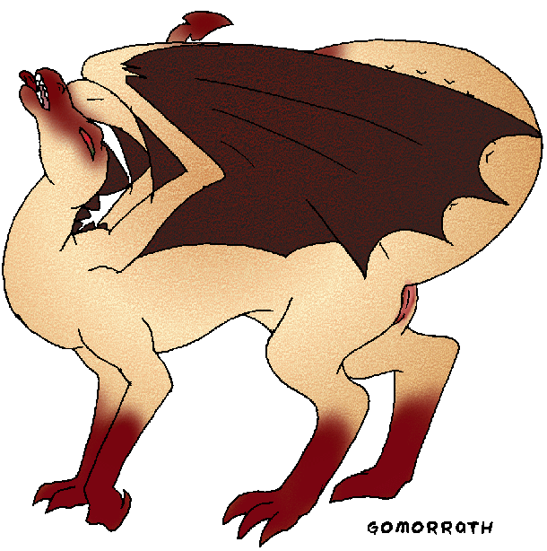 Gold and Blood Gomorrath - going with Aleka (you lucky girl) A long, large dragon, around 39 feet long and with long legs to boot. She really loves putting up that tail just to show the boys what they're missing. She is a quick, strong flier, but hey - she really wants to get laid. Who doesn't? Her markings (her lovely markings, get close to them, you know you want to see them up close) should transfer to the next generation, along with her ... horniness. Expect that cross gender, oddly colored and marked, as well as the possibility of gender switching may occur. |