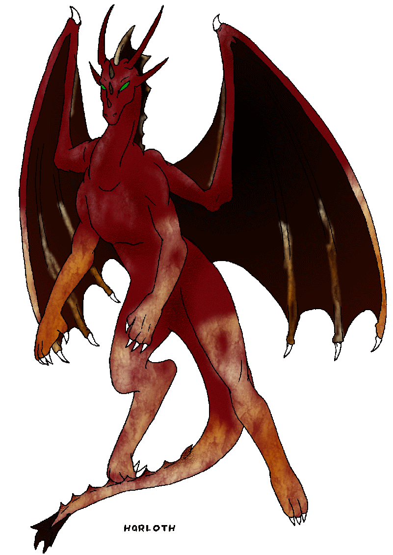 Red Gold Black Harloth - Returned to Healing Den This girl is the belle of the ball, the crowning achievement of the Naughty Flight. At a massive 55 feet long, and bipedal to almost 30 feet tall, she is one impressive dragon. Blood with gold-lace stocking markings, this seven-horned bitch will certainly be willing to put other females in their place... Right on her lap perhaps? She would be more than happy to pair up with a female. She IS female, but with a sire that's 'both' she certainly doesn't mind the thought of doing some ... interesting tricks with another female. Her offspring will be large, dramatic, and most certainly have gender 'issues'. **This... I love this picture. :) To me she IS the belle of the clutch, so I hope she has a home to go to. |