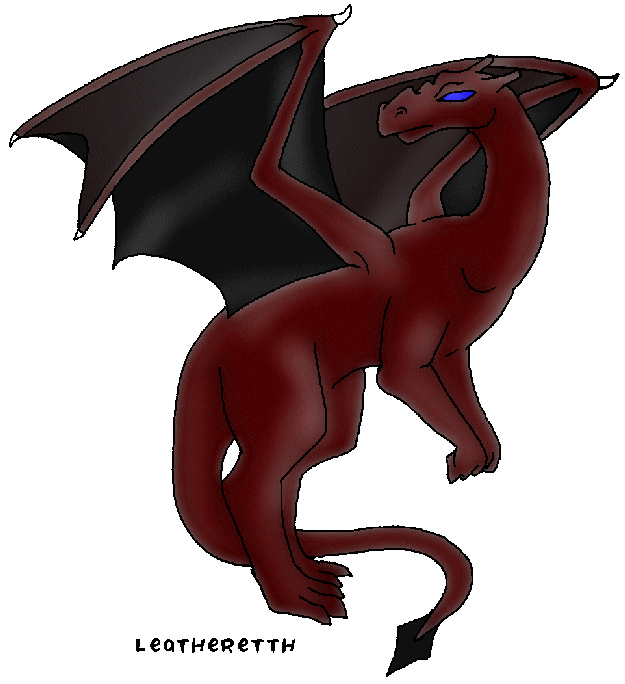 Violet Silver Black Leatheretth - going with Wagner The shine on this female's blood red skin looks like ... well, silvery cum, while her black as night wings shine of their own accord. Her job, like her sister's, is to look good. No matter the level of discomfort or how bad you need to pee, you've got to strut, pose, and look - GOOD. She's no flake though, Leatheretth has a sense of humor that borders on maniacal. She creaks when she walks - sounding like a tight leather outfit. She's about 40 feet nose to tail, and bipedal. |