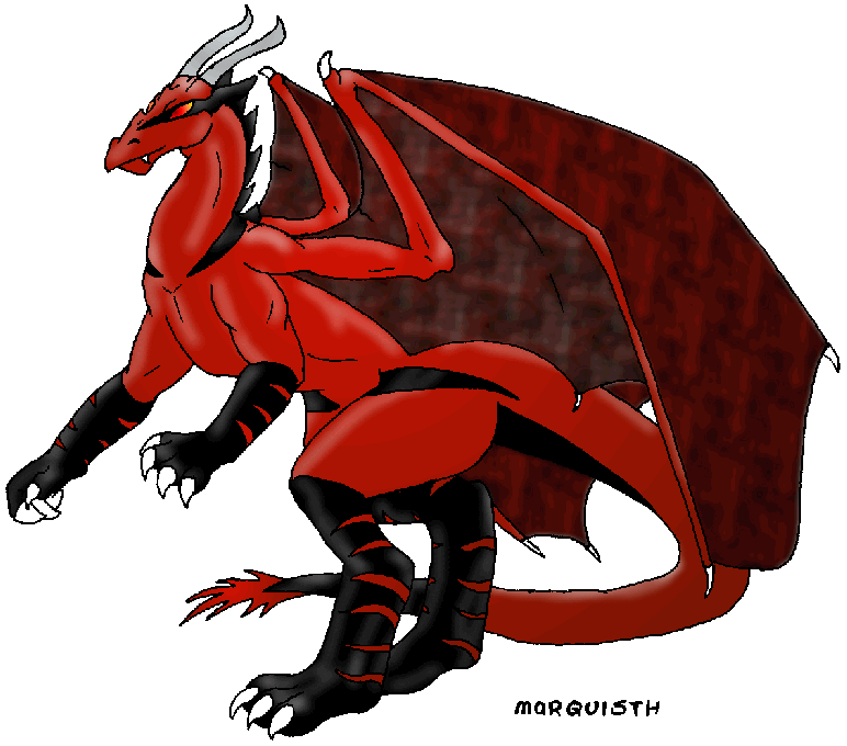 Red Black Marquisth - going with Aitan When this dragon broke his shell, everyone knew that he was one of the strongest and most determined hatchlings ever seen. With markings straight out of a fetish bar, looking as though he's got a mask and gloves is one thing. Knowing that he does, he uses that to his advantage. No one expects him to be serious - yet he is, about his 'play'. He is bloodthirsty and cruel, but also values being able to train up a partner into more hardcore things. He is small compared to his dam, but much bigger than his tiny sire, perhaps 45 feet long (his mother is huge after all), and bipedal. He speaks aloud, with a grim, hissing voice that can go so deep it's almost subsonic. **ooookay and he's ... juicy. I love this picture, all of Hessianth's as I have said before, are my very favorite dragons evar. |