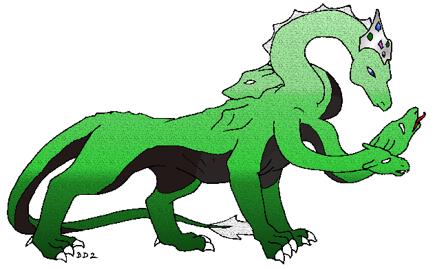 Events or History: (from original hatching and further pages I'm too lazy to organize this right now ) --The four-headed female has named herself Joakarat , a word which ironically in Hungarian means 'good will'. She has no wings, yet she can somehow levitate herself and teleport. She has a black opal indicating her gender, an Amethyst (bond), two Emeralds (loyalty) and one Sapphire (intelligence) in her silver crowned main head. Her other three heads often snap at things and must be chastised. Her father is black-opal Death. She is quite pissed off that her loyalty and bonding have been wasted on her original human bond. 10' s / 60' l / no wings Speed Run, since she is land-bound Joakarat has developed a strong but exhausting burst of speed that she uses similarly to a cheetah - it only lasts less than a minute, and if she has to do any amount of maneuvering, that time goes down rapidly. With it, she can however run overland in a straight line at an incredible break-neck pace, upwards of 120 mph, though stopping is a matter of duck and roll (which usually adds another amount she's traveling...); Teleportation, this on the other paw is a spectacularly strong power which she uses even as an attack - she can teleport other creatures, generally horse-sized or smaller, within 25 meters of herself; that said, it's easier for her to teleport herself, than to do this with another creature, and if she just needs to get somewhere within 100 miles she just goes there, and she can reliably teleport between dimensions and often enough carries Yasashii along; Telepathy, very good vocabulary which may be a remnant of her birth-bond's mind, but honestly the only reason she uses this to communicate is that she sometimes wants to be secretive or silent, otherwise she dislikes having any humanoid in her head, so she will use Verbal Speech to communicate with those things...; Unassisted Firebreath, though only her main crowned head can produce it, she can spit out a sticky napalm-like ‘fire' more like a fireball than a gout, that is not accurate farther than 100 meters, and definitely can reach up to 200 if she really wants to screw things up for people around her (casting fireball in a 10x10 hallway... yeah sure why not!) ** later she and Yasashii pair-bond ** (from death court 2021) Only seven hatchlings remained by the nests. All of them had broken their shells, though a few still picked pieces off their hides. Of those that remained, there were two purples, two blues, two reds, and a green. The lighter of the two blues moved first, angling straight toward a similarly marked green hatchling who had spent much of the hatching waiting halfway between the nests and the hydragons. Finally, the green cried, nipping at her blue brother. You took long enough. You could have helped me, the blue shot back, returning her nip. Together they crossed the rest of the distance to the hydragons, moving up to two of the great beasts that sat side by side. Joakarat and Yasashii looked down at the flea bitten siblings, a collective of nine heads lowering to be on a level with two. Joakarat, the blue spoke first, bolder and louder than his sister. He stepped forward and lifted his head high to the green hydragon. I am Zeyirth. |