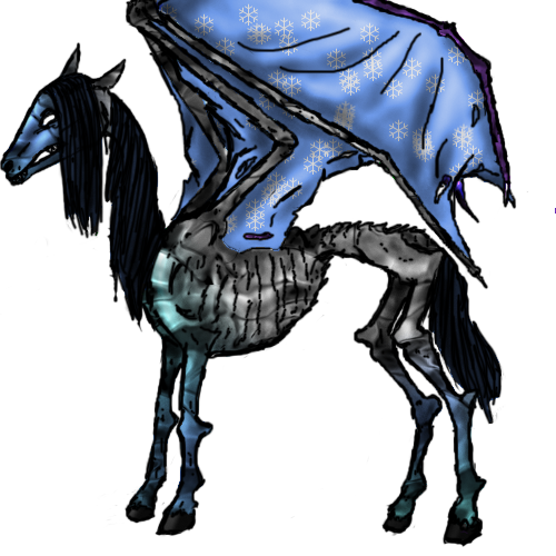 Snow Thestral! Uma's not sure when this guy arrived, but he is certainly fit for winter. His skin, while still taut and hard around his ribs and shoulders, shows a glistening kind of snowy-icy-white. His lovely wing sails are a bright contrast to everything else. Especially other Thestrals. ((DNS Winter Gather dragon 2007))