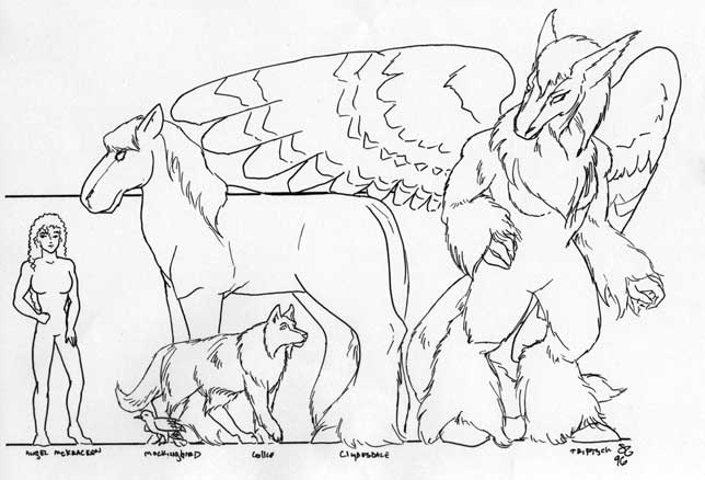 Angel had worked at a print shop for a while, before that a fast food outlet, and before that, she'd run away from home. A lot of Triptych apparently ran away from home when they discovered their first Prime, or their second. Thinking that she'd be thought of as a freak or a mutant or something, as most young teens already believe themselves, she bolted - in the shape of a sharp-tongued mockingbird. No clothes in a bag or food from the pantry, just what she'd been wearing when she transformed the first time. It wasn't really a sense of freedom so much as a sudden disassociation with what she ought to be doing with herself. Keep this information under her wing, so to speak? But she could fly! She returned home after two days of sleeping in tree branches and trying to find whatever it was that mockingbirds ate. Not too many of the local houses had bird feeders, she discovered. Her parents and sister were frantic to find her, at least that was satisfying. She hardly dared breathe a word of why she'd vanished, but to her father's stern gaze she wilted. In the den of their family's home, she transformed again. And, grinning, so did he. Her second Prime came on her when she was in high school, a fast footed and oh-so-fluffy collie. That shape she really took to heart, she enjoyed romping around in the nearby canyons and racing with the coyotes. If she concentrated hard enough, she could even change between collie and mockingbird in time to catch herself from a fall over a gorge. Sweeping over the treetops and calling out in that loud flexible voice she had, she returned to her house and was immediately sent to the shower - collecting enough grime for half a family, she had four paws to drag through the mud and not just two feet!? As Angel got older, she discovered that her sister also had a Prime, some kind of small bird, smaller than hers. But while the discovery was a pleasant one it didn't last. Their mother had a nervous breakdown when she found out: she wasn't one of them. Only their father. Angel's sister Debbie was young enough (younger by far than when Angel had first shapeshifted) that she only wanted her mother to love her again. She swore, promised crossed her heart and on a stack of Bibles that she'd never ever change again. So she didin't. Angel was perturbed by this, it was a hard decision that she herself made, when sixteen years old, that she would not make that promise. Her father and mother eventually divorced, splitting the children up - all but voluntarily. When Angel got her first job, just before her eighteenth birthday, she also figured out what her final Prime was, a huge clydesdale horse. She'd been around them once or twice, impressive beasts at the beer park that her dad liked to visit when it was in town. They were seriously the biggest things she'd ever seen - wouldn't it figure that a girl who'd been trying to keep her weight under control like any normal teenager, would turn out to be one of the largest land mammals available? She joked about it with her father, whose own third Prime was another breed of horse. Life went on for them, essentially unchanged from what either could expect. Without the anger and enforced embarrassment of her mother, and the pleading insistance of her sister, Angel was an outgoing, sensible, and somewhat commanding young lady. And food service was so not what she wanted out of life... Her father was an engineer for one of the city departments, fixing buildings that weren't up to code or something. That didn't much interest Angel either, but she knew she had to do something with her time, after graduation. She attended a few college classes, mainly to stay on her dad's insurance. Enjoying the last of her teen years with only a half-assed school attempt and a mix of contempt and thrill at being fired from her hash-slinging job, Angel found that she could do pretty well behind the counter as well as the press. Print shops were becoming a thing of the past, in the modern age of computer printers and laser jets. But a well-done business card or a set of wedding invitations were actually something she discovered she took great pride in. It was a nice set of skills, she thought, but it wasn't exactly everything in the world to her. She could get a degree in art, or design, and with her experience in the field, she could probably get a better job working for a book publisher or art company. At last, when she was twenty three and had completed a BA in design while working still at the print shop, she set out for her own fortunes. She knew that her father would miss her, but then again he was busy picking up women at pubs and she didn't really need to be in his way. Now she had to find an apartment and really get going on her own life. *** Just about the time she was leaving her third job interview for the day, well into her first month without a job, Angel thought she saw something in the corner of her eye. A flicker of red and white, like blood on a pure white bird. Was something hit? Did a car hit one of those heron things that roost out here in the boonies? She walked down a side street, the rustic neighborhoods in the rural areas of the county held lots of trees and even had horse ranches, something completely different from her very urban upbringing. But the apartments were cheap, here, and there were a lot of smaller start-up companies... None of which were hiring. In a sense, Angel was seeking something other than just whether there was an injured bird out there... When she came upon a pond that was surrounded by tall willow trees, the street long behind her and ignored, she saw that bird that had flickered in her vision. Pure white, like more than any of the dingy grey-blue birds that would have lived in this area on their migration. But the beak was brilliant red, a blood color without being an injury. It stood near the edge of the water, and then ... Shapeshifted into a girl. "Hi," the young woman said. Her pale skin was dappled with 