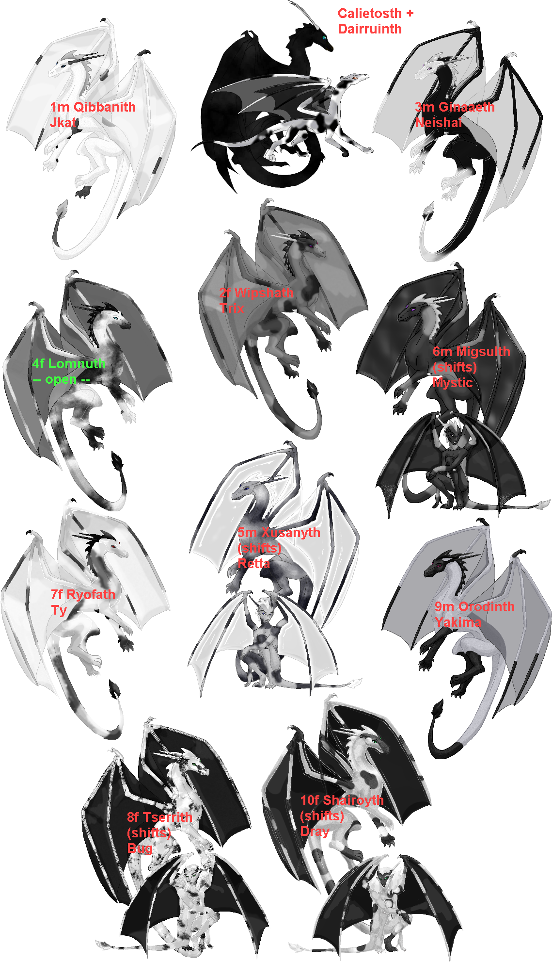 Pernese-Alskyran/Danachian/Eienic Mutt, four legs and two wings, feet have apparently retractable claws, wings have large wrist thumbs with thick claws; angular head with knobs having very long and sharp horns, faceted eyes, and a jagged tall crest, echoed on the spade of very long slender tail Naming is throwback -TH ended as most of their lineage has it, why not theirs? Knockoffs are -CADA Knockoffs stats: have 2s in most, with a 5 in one, your choice; powers average of 3 in most, do not have any shapeshifting nor can they carry it; select one from Telepathy, Verbal Speech, Local Teleport, Nexus Teleport, or Telekinesis to have at 5; they may have Void magic abilities but unless they have a specific attachment that can help them learn, they cannot master spellcasting (Void tops out at 5, spells at 2 even then) Clutch is presented during the 3 hours until Midnight block, the last to be shown off in that time frame