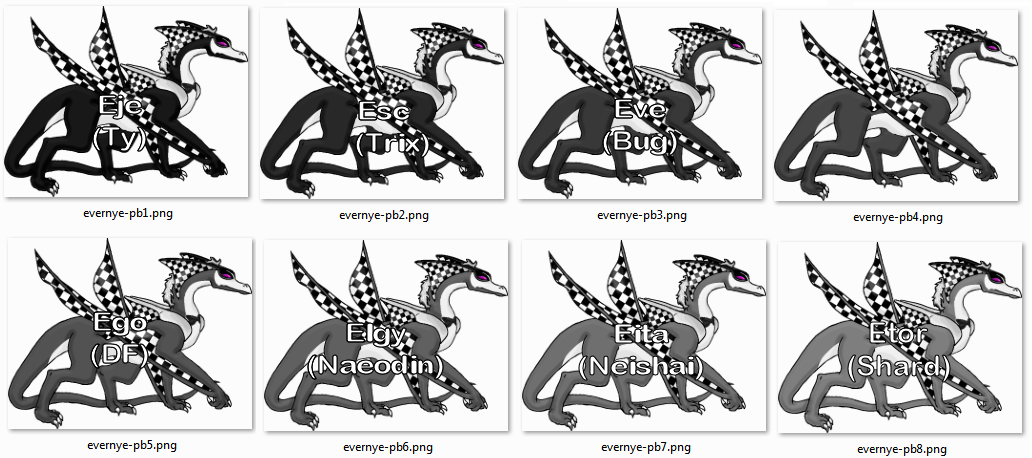 | Eita Z | Bond: Sponsored by Voivode & company; multibond to Nalokeba +? multibond to Eita (and others as collected) "You don't even know what it means," another echoed back in a sing-song and oddly formed voice. "I know better than you, you don't even need one!" "If you want a bond so badly why don't you just get one?" "What makes you think I didn't already choose?" The creature growled, stern and mighty and adorable. The other one gave off a scoffing chuffle. And then it realized, "hey... waaaaait a minute!" Voivode watched as two small dark checerkboard-winged dragonets stomped by. They apparently had bonded to one another, well perhaps a one-sided ... nah, he gave a tiny smirk as the smaller dark one nudged up against the larger (they were both tiny!) snappy-marked helper dragonet and that one nuzzled their new permanent friend protectively. When they noticed the vampire lord watching, the bigger of the pair raised its head high and proud. The night is almost over, we want to go home with you, see what your ... kingdom? is like! I am Eita, this is Nalokeba, and I suppose we come as a team. The darker one sat up straighter, though tiredly, We can guard things, or do jobs, or... "You should just get some meat, and sleep it off, little ones," Voivode said softly. He could easily imagine the tiny dark Nalokeba curled up like a cat... he could imagine that because the dragon did exactly that the moment it found a lap - his. |