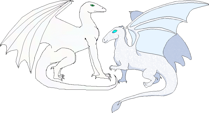 | Ologesu | Bond: Flutura, Impressed Multibond (see ANTE) Fluttering up to the arched ceiling rafters, Flutura dangled their legs off the elegant metal strut and swayed a little. They sighed, it was so early in the night, the big clock said 4 hours until midnight, and they were already at a bit of a loss of what they could be doing. You could come with us, they felt a mind brush up against theirs, and glanced around to see where it had come from. Well it wasn't easily obvious, because there were a dozen or more dragonets on the dance floor bumbling and bouncing around trying to avoid getting stepped on. They needed to get a closer look, now. Flying down they tried to home in on wherever that mind had come from. There were a few people who gave stern looks - a child, here? Well yes. And they were about to give one of those grumpy adults a piece of their mind when a pair of dragons cornered them. They were quite different looking, bright and dark bodied, contrasting wings, but Flutura did start seeing their different traits beyond just colors. It was us, I am Neijoerschdagth, this is Ologesu. "Bless you," they said on hearing the name, and giggled - suddenly hoping that the dragons wouldn't be offended by their action. It didn't look like the dragon was bothered at all. The white one had a long neck and elegant slender wings, which she folded over her smaller companion. That littler one wouldn't be very big at all, neither of them would, but it would be ... "Both of you are lovely! And small enough to ride!" They caught a memory from Flutura, of a massive steed and bouncing around on its huge back. Ologesu nudged its head out from under their companion's wing and gave a snorting, draconic laugh. |