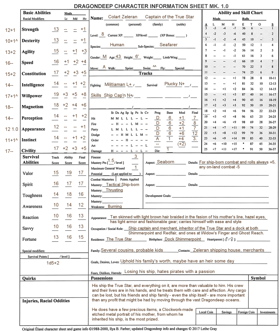 History: As a child growing up in the Zeleran family, Colart was definitely a favorite. Not just of his mother Ciryia, but of pretty much anyone with sense in their head. He wasn't just quick witted and charming, he put his hands and legs and back into it - a genuinely talented boy who could tie exactly the right knot or hoist a difficult sail (even if he wasn't heavy enough to do it alone), swab the deck or count barrels in the hold. Though he is not the eldest child in his mother's surprisingly long list of kids, it is Colart that inherited her particular ship, and even if she's not quite retired enough to settle down in Shimmerport he knows that's where she will wind up when she can no longer walk with confidence on her smaller craft. Colart's education was extensive and is math-heavy, but the ease with which he learned accounting and business surprised even grandfather and the uncles. But they know that he's much more than that - by the time he was barely able to sprout a beard, he was able to organize the crew of any ship into motion. Of course also by that time it was hinted that the girl from the port's money exchange would be caring for a child that had suspiciously golden hair to her raven black... For many years, Colart proved himself worthy of the title Captain, even making sure that in a few battles with pirates the crew and ship were safe. Those battles could be recounted by everyone aboard, he's never lost a shipmate. Around 15 years ago, in his prime and with the solid backing of the Zeleran family, Colart began taking on crew that hadn't been simply 'there when he inherited the ship' - not a full swap, there are still shipmates that have been on the True Star since he was a kid, and will likely continue to be there when he's gone (those long-lived Dragonkin, probably the Necromancer...). But many of the newer ship crew were brought on board on a specific year-long journey around the world. He wanted to surround himself with 'the right people', and he got them by the dozen. As time has gone on, many of the original hands have retired or moved on to other duties at ports across the world, but whenever the True Star is docked, you can bet there's a bunch of them willing to help out. And then a couple years ago, something else happened. He had to check map after map - and only the newest ones, penned within the last decade or so, had this unusually large and obviously-volcanic island on them. The True Star encountered what came to be known as the Gelgelan Eminence - a 'new' island where there had been none before, very far north of the Island of the Blessed Idols and east a ways, past the Churnwaters. How could a place a thousand miles across have been missed by cartographers and dragons alike? It turned out they hadn't. The island had appeared just a few decades ago. A magical disaster of epic proportion which, given how many Portals and Gates Dragondeep has, seems like it should be more common than 'twice ever in recorded history'. A huge number of cities, towns, villages, and ports came from another dimension entirely, and ... quite a few of those places instantly were washed away since the caldera it appeared in was open to the ocean. But still, a land like this? With humans, demons, and rabbit-like Gelgelan to populate it? A business opportunity like this arises once if ever in a lifetime, and Colart took it. The Gelgelan Eminence's great rift can't be called a 'river', being more than fifty miles wide at its mouth it's more like an inland sea. Where it's easy to port, along almost the entire thing? So... Now Colart has connections among the 'Usagi', the rabbit-people of Gelgela, and included among those are the queen Sean, and her human king Sapadt. And their kids. A lot of them. Almost all of whom have dragons that have paired up with them. Not local dragons. Not like the Dragonkin tend as eggs in the shallows, not like the hatchling dragonets without eyes and with hardly more thought than what might be eaten. No, these dragons were intelligent and small enough to ride, colorful, dramatic. And they 'searched' his whole crew in one fell swoop. Whether they realized it or not. Colart knew this would be weird, but not this weird. Thankfully then, his crew happened upon another island that wasn't on any chart. And it won't be, except their own. Like as not, this island would have become a haven for pirates had they encountered it first. But no pirate had better dare set foot on this Grotto of theirs. With careful bending of the truth, Colart makes sure that no outsider knows where the Never Ending Grotto is. And he has help: some of those dragon riding Gelgelans and their friends make sure of it, if they catch mental or magical wind of anyone nearing it, even dragons local to Dragondeep, they hush it down, bury the memory, sway creatures and crews alike away from the place. Because it's where Colart's crew and many others found since then across Dragondeep, will be raising their own dragon friends, a haven for offworld creatures safe from the locals, somehow. Colart has impressed upon his crew how important it is to keep this place safe and silent, and because of his charm and wit, and their dedication to the task, the whole ship's crew have a pact of silence about it. It's true they miss their dragon friends when they can't be near, at any given port they'd need to remain very hidden after all. But out at sea, they're often joined by these amazing dragons. In the sea or in the air, or just perched on the True Star's masts. Now, after a few of them have found their friends on very distant worlds (how is the ocean meeting these worlds? Because they navigate the ship to them, and from them back into Dragondeep's waters...) it seems that one port wants Colart himself to step onto their 'sands'. The Vella Crean, a massive city, with beautiful islands off the coast, and 'labs' that provide spectacular dragons. It is to their sands that Colart Zeleran has been invited, and which