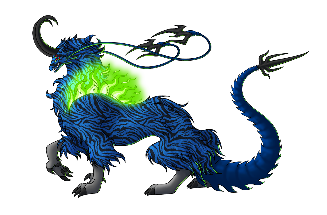 Colors: body light grey, fur medium blue with black complex stripes, tail dark blue, green balefire