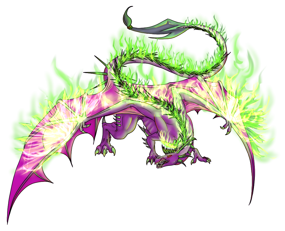 Colors: body dark grey, with fur light grey strewn with wobbly lilac and red-violet, tail dark purple; bright green balefire