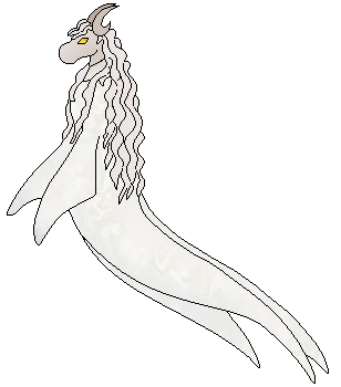 Features: is a ghost, only partly visible as a draconic creature with a muzzle, moon-curved horns, and 'forelimbs' draped with the cloth of a ghostie