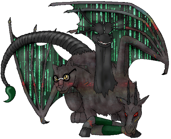 Canny, three headed, and entirely too talkative. Well I suppose that without the heads, she was still me. She had almost glowing wings with the distinctive Matrix markings (had she started there? or just got them modified there?) and that whole chimeric head thing was pretty cool once I got used to it. "I think you should do more art," said the cat head. She tapped her forehoof, and the goat head agreed. "Or more writing, stories are always good. You know that you didn't quite create us, yet you are still our self." "Never mind the mysterious horny one," the dragon said, with a grin. She flicked her poison tipped tail, "you ought to create more worlds again. We cannot do it alone, you know." "We are rather like Aslan," the cat-head asserted with a hissing laugh. "Only not so allegorical." "Especially with a beast like you connected," said the goat to the dragon. The dragon bit at that head but the horns kept her at bay. Wouldn't this be entertaining... *** Chimera-me - who for some reason loved being called by all three of her names - Sara was the cat, Letha was the goat, and Katrina was the dragon - managed to get it into her heads that she should chase off visitors. One day, I was chatting with the librarian in the school, and she handed off this piece of 'fan art' to me. "I think they're a bit scared of the ... other dragon..." "I bet, I think I'm a little scared of her. Oh my gawd," I said, looking at the picture. "The only thing wrong is there's only one cat." "No there's two, look, behind your aching butt," she pointed out the shadowed feline. "Oh wait, here's another one, I think they were trying to get into the yard. Your cats, you know..." "My cats, the cheetahs? Ooookay," I took the next, and it was apparently a running gag that I'd yelled 'get off my lawn' more than once in jest. Maybe they didn't realize I was kidding? "I'll have a talk with her, because this," I waved the paper in the air, "is hardly how I want to be remembered..."