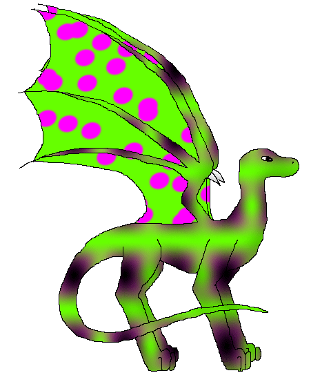 Features: scaled hide with armor plating on belly from chin to tail; four legs with three large clawed paws, four fiery wings that do not offer actual flight; noodle shape; head boxy with large fangs, chin and jaw spikes, and back-pointing short pointed horns; neck and tail have burning 'fur'; egg layer, likely to pair up with other scaled or similar dragons rather than the brightly marked girls below