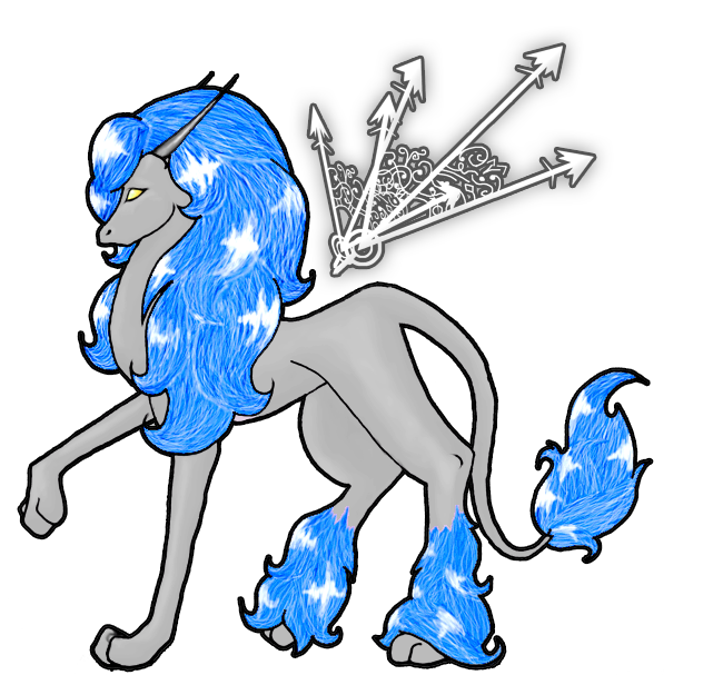 Colors: pale shiny blue body, floof brightly ice white, horns silver, eyes medium blue, wings sky blue glowy ice