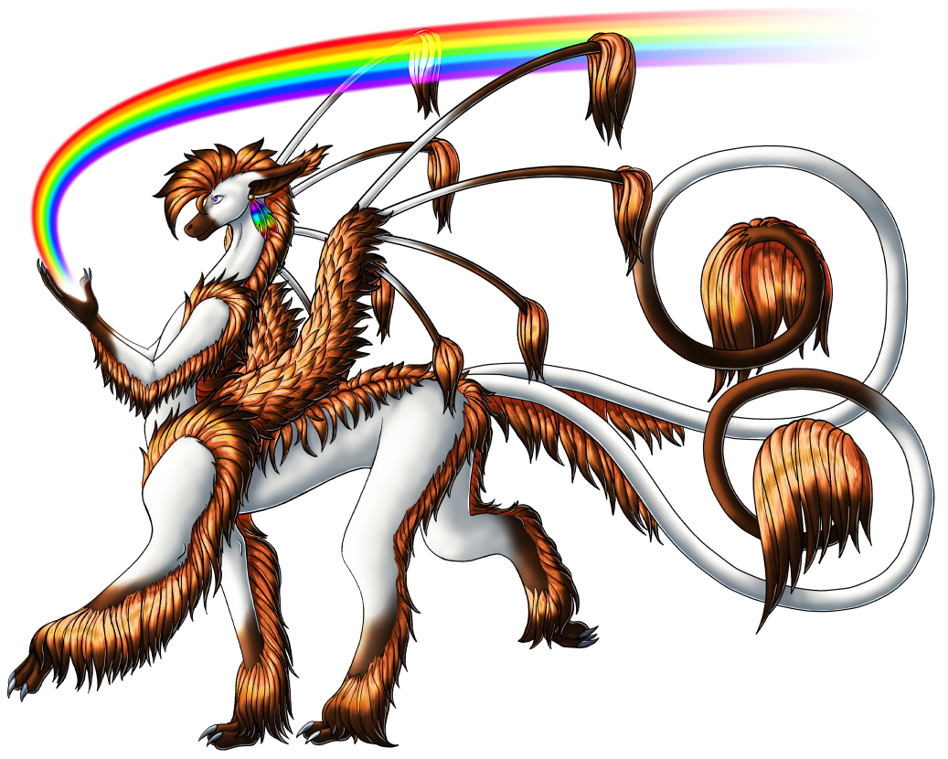 Features: 1/2 Kessonan dragontaur, 1/4 Y'ughai, 1/4 dragon mutt as shown, four long and muscular legs with floof on backs, long clawed paws; upright taur shape, body is narrow and slender, with two slender fringed arms with long fingered hands; long neck and narrow muzzled small head with large external plumed ears, upright mane from forehead to full back continues to rump; two flightless fully fluffed wing arms with four fingers bearing thick plumes at the ends; two very thin, very long tails with plumes under from rump and large at ends