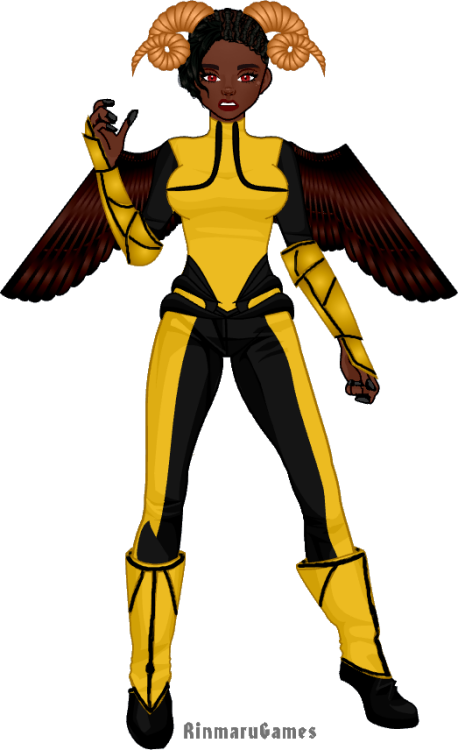 Hair: charcoal black, usually kept in braids or when natural wooly it's literally wooly her dad's a ram Kin. Does like having a little straightened or some playful extra, a weave sometimes, beads or other accessories, but it does all have to work under those horns
