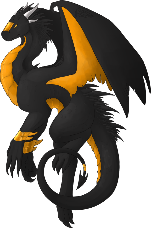 Colors: Black and Orange, graphite-asphalt body and limbs, backs of wings; belly, under wings, face and forelimb and tail stripe orange, light yellowish-warning tape shaded, highly reflective on limbs, tail, and face; white horns